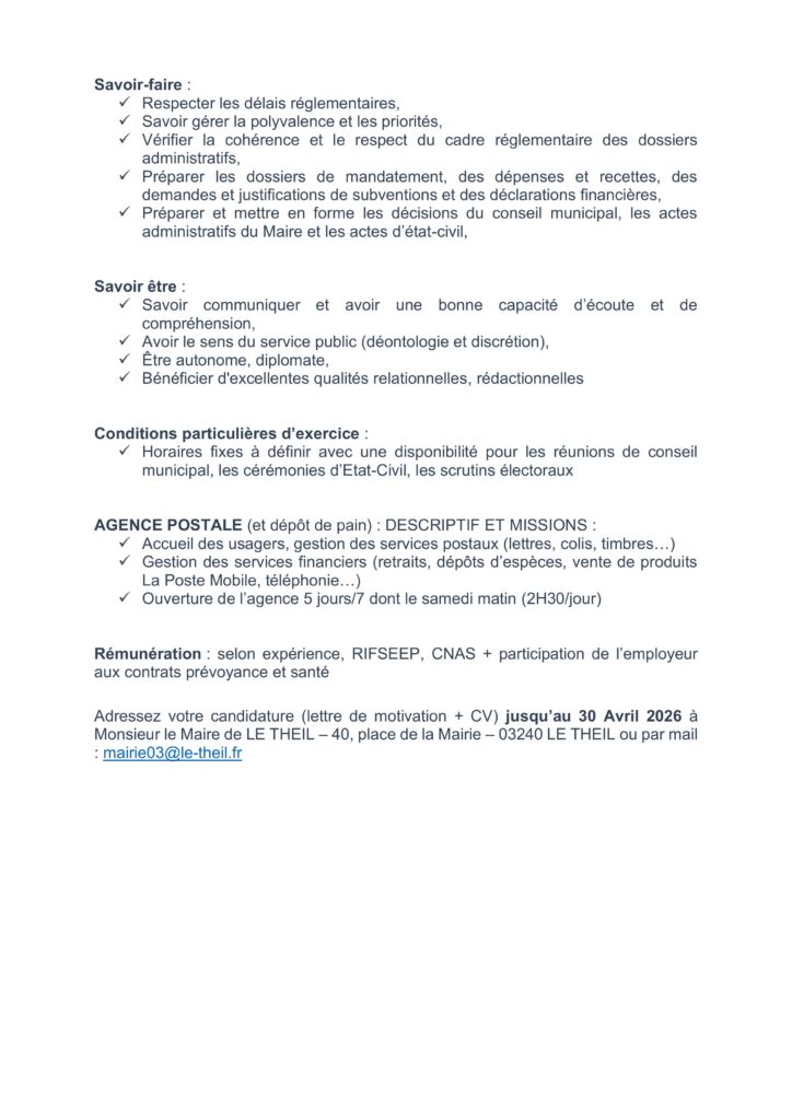Adressez votre candidature (CV + lettre de motivation + dernier arrêté de situation administrative) avant le 3 mai 2026 à Madame la Présidente de la Communauté de Communes Pays de Lapalisse – BP 63 – 03120 LAPALISSE ou par mail : odile.fraty@cc-paysdelapalisse.fr