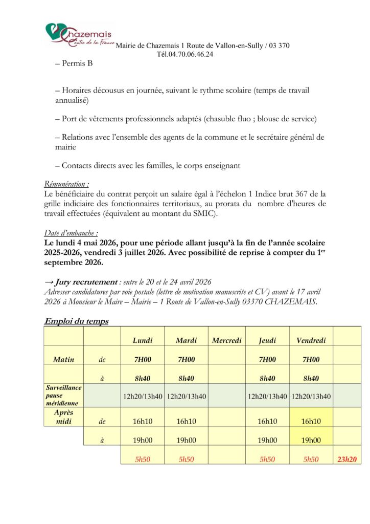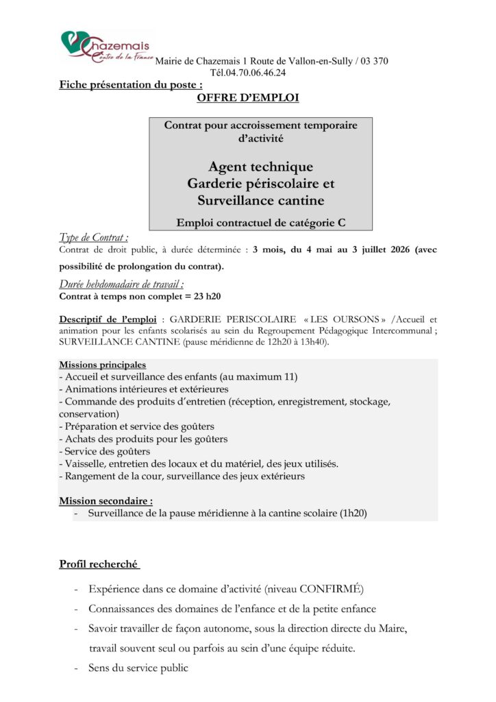 Adressez votre candidature (lettre de motivation + CV) à : Madame le Maire de Valignat – 15, Allée Saint-Michel – 03330 VALIGNAT ou par mail : mairie-valignat@wanadoo.fr